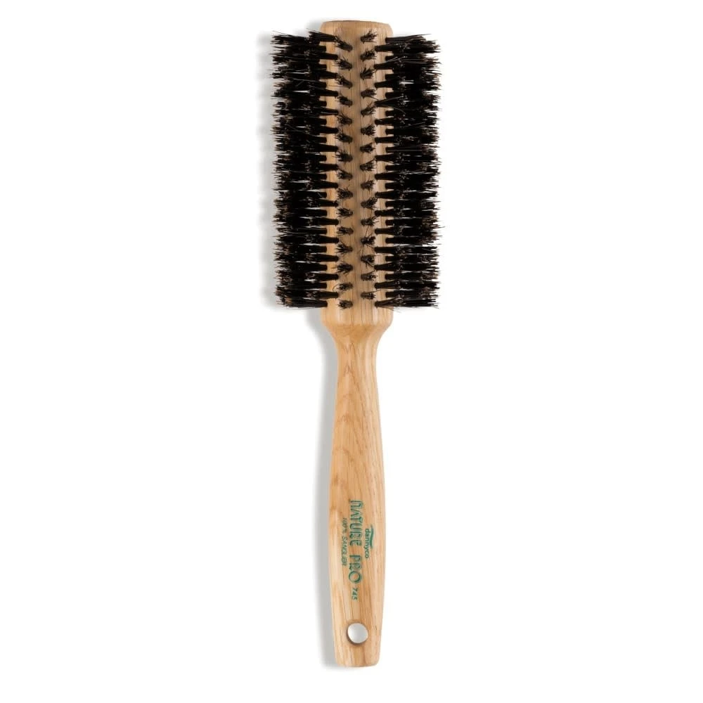 La brosse ronde « Natural Pro » de Dannyco. Les poils naturels de sanglier sont antistatiques et très doux pour les cheveux et le cuir chevelu, le manche circulaire en bois de chêne pour une prise en main confortable et légère.
