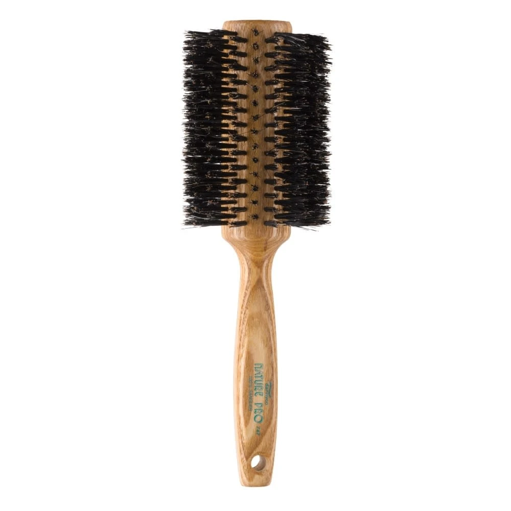La brosse ronde « Natural Pro » de Dannyco. Les poils naturels de sanglier sont antistatiques et très doux pour les cheveux et le cuir chevelu, le manche circulaire en bois de chêne pour une prise en main confortable et légère.