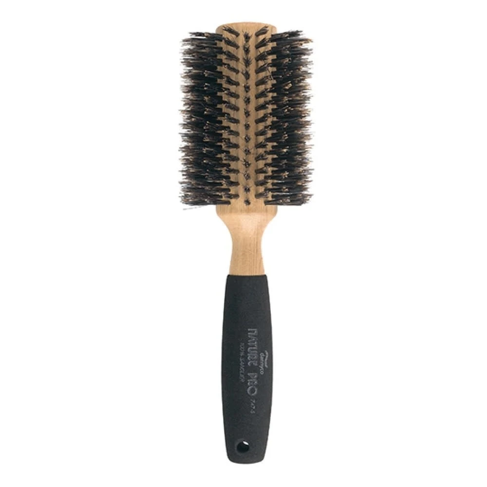 La brosse ronde « Natural Pro » de Dannyco. Les poils naturels de sanglier sont antistatiques et très doux pour les cheveux et le cuir chevelu, le manche circulaire en bois de chêne recouvert d’éponge pour une manipulation confortable et légère.