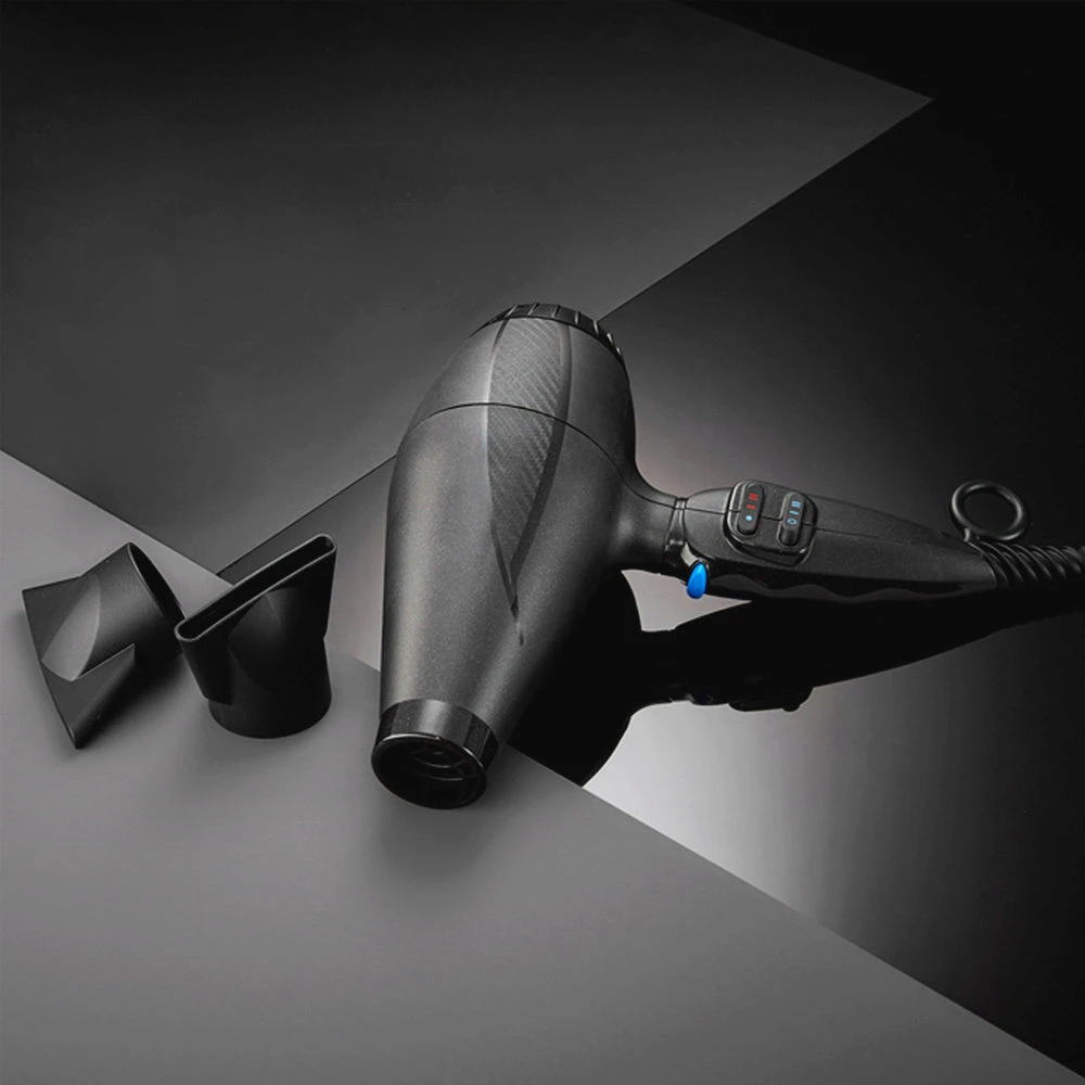 Un sèche-cheveux professionnel puissant, fabriqué en Italie, 2 100 W avec moteur AC qui génère une vitesse d’air de 141 km/h pour un séchage rapide et un gain de temps.