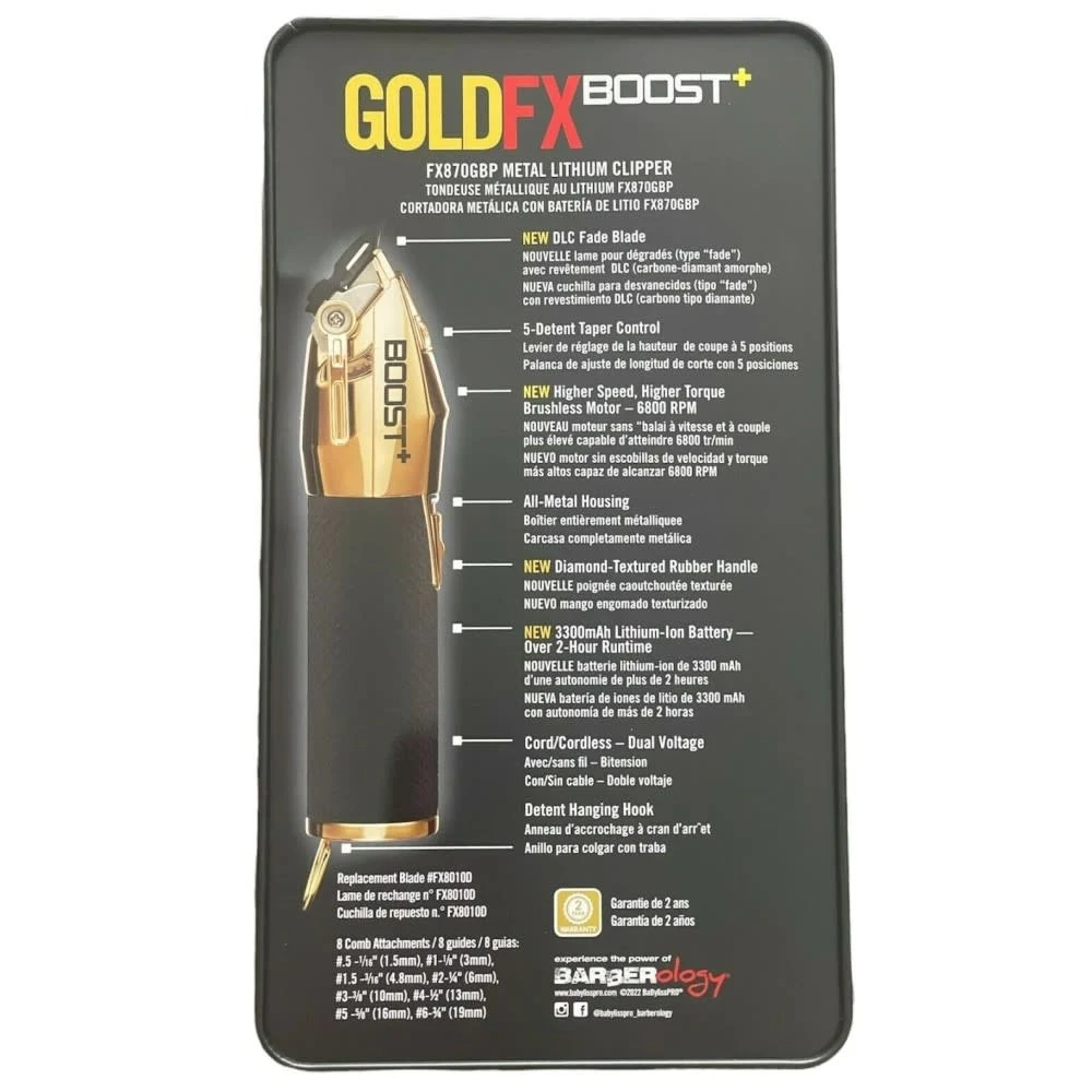 La tondeuse GoldFX Boost+ de BaByliss PRO avec boitier métalique et pile au Lithium est dotée d’un nouveau moteur sans balai à vitesse et couple plus élevés – 6500 tr/min !
